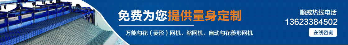 | 安平縣順威絲網(wǎng)機(jī)械設(shè)備制造有限公司自產(chǎn)自銷,省去中間環(huán)節(jié),讓利給客戶,真正的讓您省錢。主要產(chǎn)品有:萬能勾花(菱形)網(wǎng)機(jī)、縮網(wǎng)機(jī)、自動勾花菱形網(wǎng)機(jī)、全自動勾花菱形網(wǎng)機(jī)。 |
